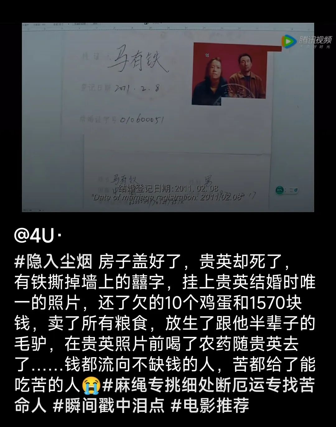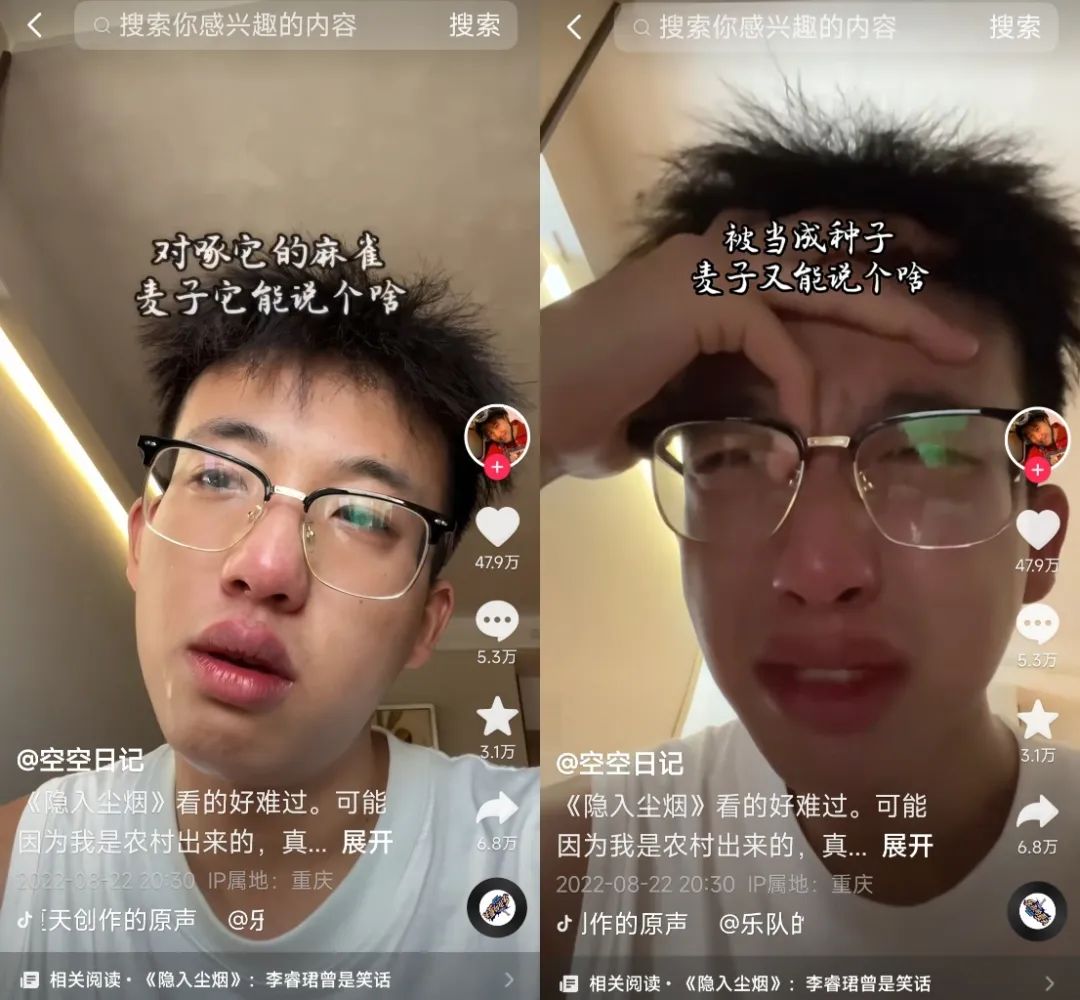 鏡頭中的空空眼淚大顆大顆落下,鼻子通紅,背景音是抒情歌曲搭配電影中馬有鐵的經典台詞:「對鐮刀,麥子它能説個啥;對啄它的麻雀,麥子它能説個啥;對磨,麥子它能説個啥;被當成種子,麥子又能説個啥」。該視頻獲得了累計 47.3 萬的播放量,評論區中聚集着大量被影片打動的觀眾。