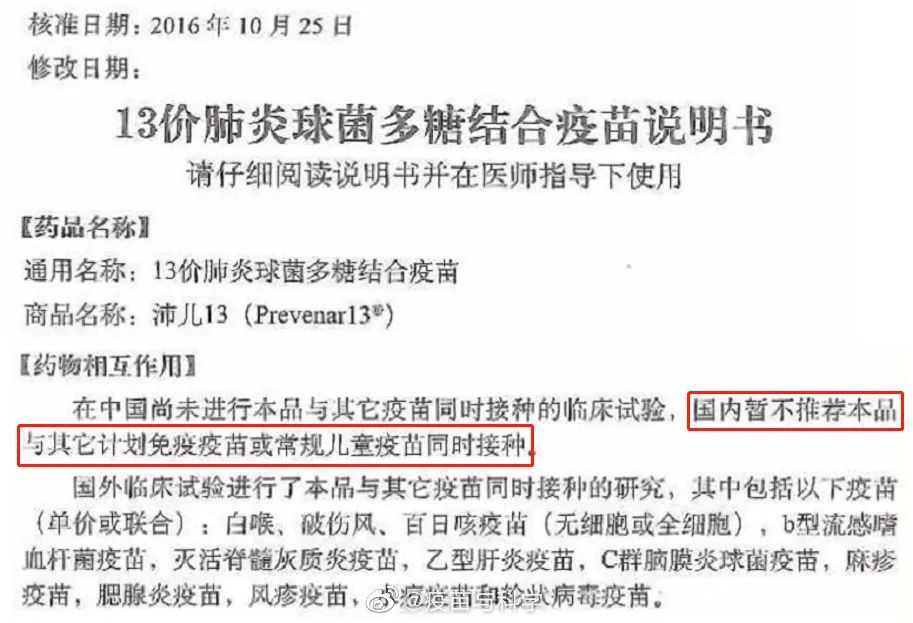 肺炎13價結合疫苗(沛兒13)説明書明示:在中國,暫不推薦與常規兒童疫苗同時接種。