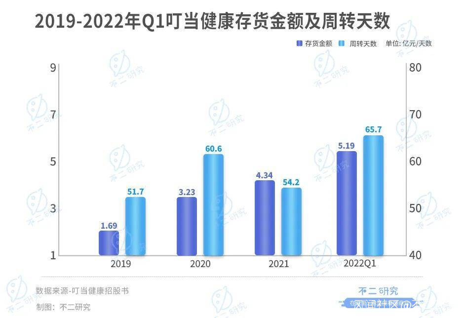 2019-2021年及2022年一季度,叮噹健康的存貨金額分別為1.69億、3.23億、4.34億和5.19億,據此前招股書顯示,2018年的存貨金額為0.63億元,同比增速分別為168.72%、91.91%、34.18%和727.39%。存貨週轉天數分別為51.7天、60.6天、54.2天和65.7天。