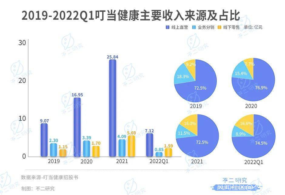 據招股書顯示,2019-2021年及2022年一季度,來自線上直營的收入分別為9.07億、16.95億、25.84億和7.12億元,佔總收入的72.5%、76.9%、72.5%和74.5%。來自業務分銷的收入分別為2.30億、3.39億、4.09億和0.85億元,佔總收入的18.3%、15.4%、11.5%和8.9%。來自線下零售的收入分別為1.15億、1.70億、5.69億和1.59億元,佔總收入的9.2%、7.7%、16.0%和16.6%。
