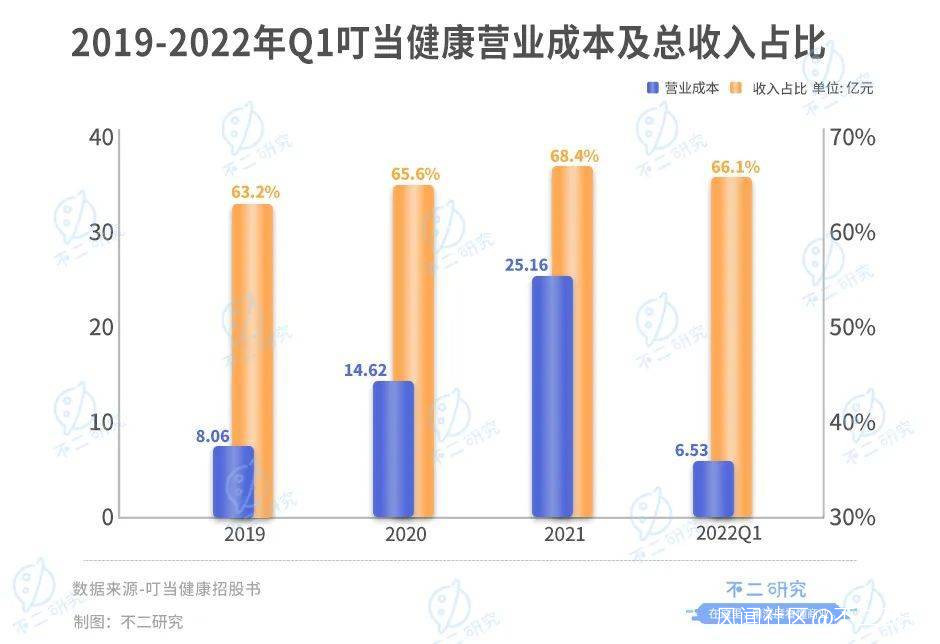 據招股書顯示,2019-2021年及2022年一季度,叮噹健康的營業成本分別為8.06億、14.62億、25.16億和6.53億元,佔總收入的63.2%、65.6%、68.4%和66.1%。