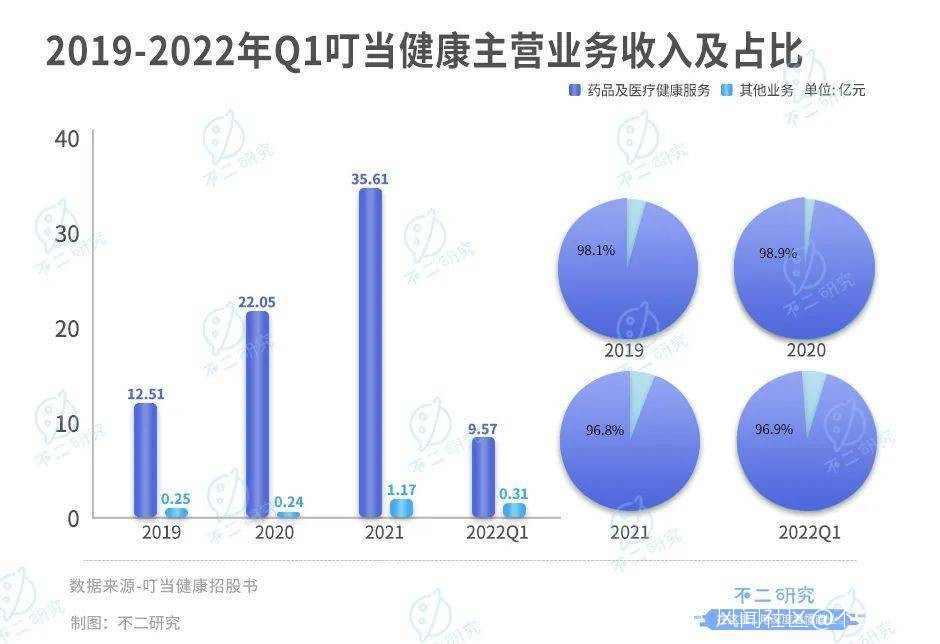 據招股書顯示,2019-2021年及2022年一季度,來自藥品及醫療健康業務的收入分別為12.51億、22.05億、35.61億和9.57億元,佔總收入的98.1%、98.9%、96.8%和96.9%,據此前招股書顯示,2018年該項業務收入為5.62億元,同比增速分別為122.5%、76.2%、61.5%和70.18%。
