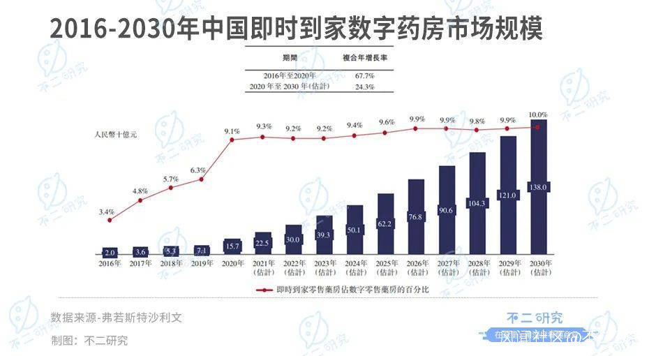 據弗若斯特沙利文報告,2016年至2020年,即時到家數字藥房市場以67.7%的複合年增長率自2016年的20億元開始大幅增長,預計2030年將達到1380億元,複合年增長率為24.3%。此外,預計數字零售藥房市場上的即時到家數字藥房的佔比將從2020年的9.15%增加至2030年 的10.0%。