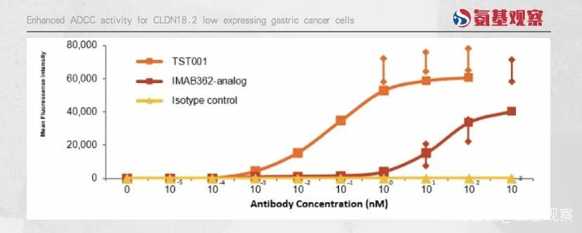 得益於此,TST001擁有比安斯泰來產品Zolbetuximab更佳的結合表位,最終具有兩大優勢:與腫瘤細胞更高的親和力,以及和NK細胞更好的結合效率。
