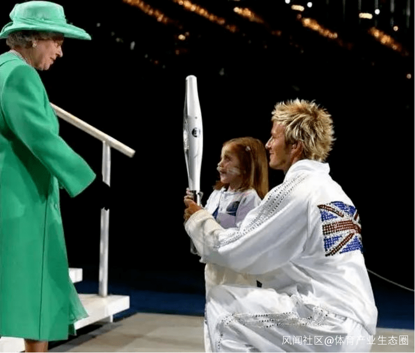 貝克漢姆與小女孩科斯蒂一起,將接力棒遞給了伊麗莎白女王:
