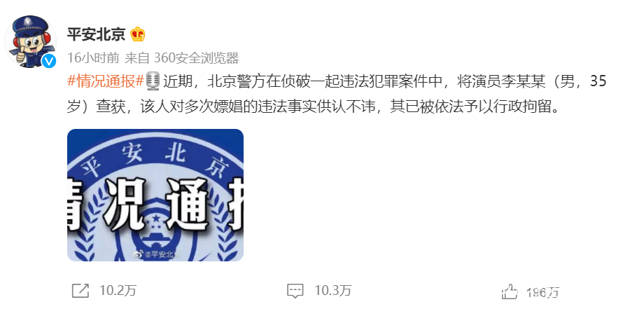 近期,北京警方在偵破一起違法犯罪案件中,將演員李某某(男,35歲)查獲,該人對多次嫖娼的違法事實供認不諱,其已被依法予以行政拘留。