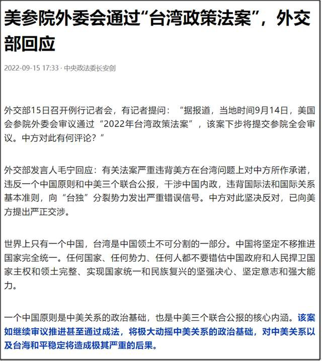 我也是提前跟大家預警了美國9月的一些拱火點,其中也提到,今天美國參議院外委會通過的“某個法案”。