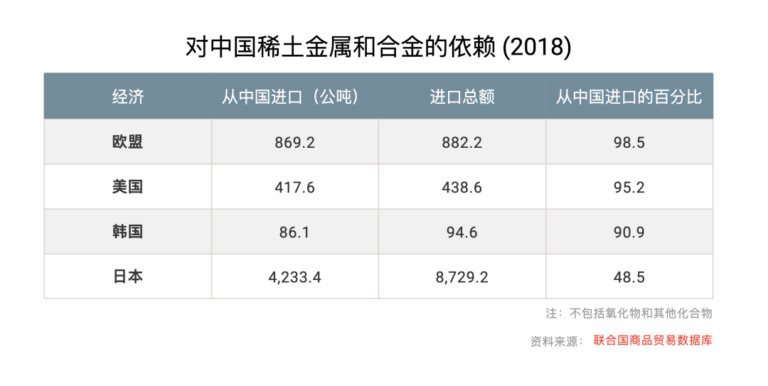 2018年,世界各國分離稀土總量為14.6萬噸,中國就佔了78.8%。更值得注意的是,當年全球90%的稀土金屬合金、60%的釤鈷磁體和75%的釹鐵硼永磁體都是中國提供。