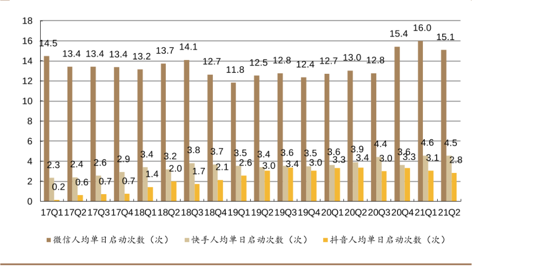 根據德邦證券統計顯示,沒有社交關係鏈的抖音雖然是個“殺時間”利器,但人均單日打開頻率並不高。對比來看,微信人均啓動次數保持相對穩定,均值為 13.5 次,快手次之,抖音最低。