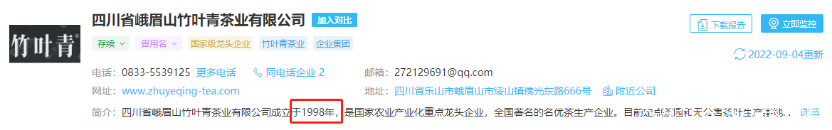 但根據天眼查APP顯示,四川省峨眉山竹葉青茶業有限公司早在1998年就已成立,而如今茶行業仍存在“有品類,無品牌”的痛點。這足以説明,竹葉青並未改變茶行業的格局。而且橫向對比來看,無論是營收規模還是品牌知名度,竹葉青在茶行業都不算頭部企業。