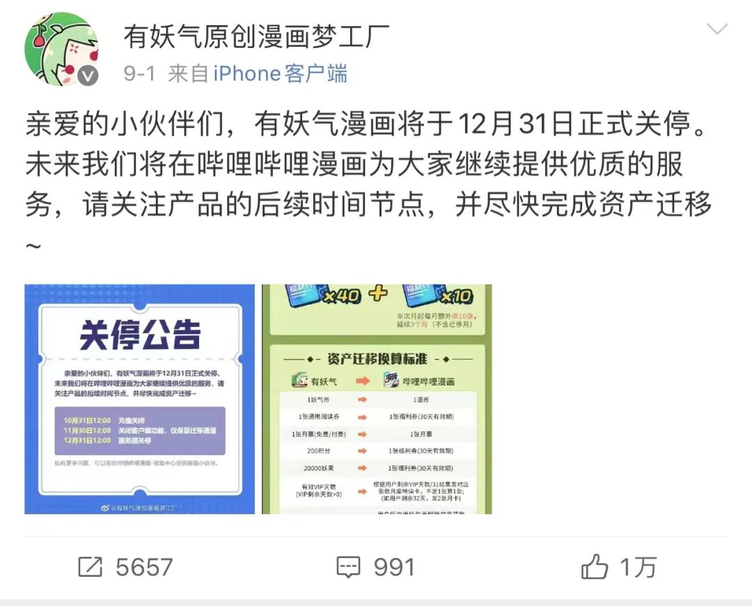 9月1日,有妖氣原創漫畫夢工廠賬號發佈公告,稱平台將於今年12月31日正式關停,呼籲用户儘快完成資產遷移。未來有妖氣漫畫將在嗶哩嗶哩漫畫提供服務——去年11月,B站花了6億人民幣全資收購有妖氣漫畫,從被收購到閉站,僅僅只經過了一年時間。