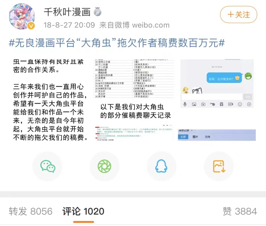 2018年的漫畫平台大角蟲欠薪事件就是一次集中爆發。當年8月,欠薪400萬的大角蟲漫畫遭到近50名漫畫作者的集體聲討,引發全網關注。網易漫畫也在它原本計劃上市的這一年,走完了它短暫的一生,像後來的有妖氣一樣賣給了B站。