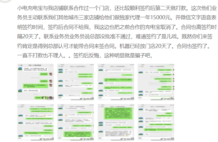 其中,有商家在投訴平台黑貓投訴上表示,“小電充電寶與我店鋪聯繫合作過一個門店,還比較順利,簽約後第二天就打款。這次他們業務員主動聯繫我們在其他城市的三家店鋪給他們做獨家代理,一年15000元(入場費)。簽約後合同不給我,我這邊已經把之前合作的充電寶撤了,聯繫業務員,業務員説總部沒批准。”並指出,小電充電寶的機器已經放門店20天了,卻一直不打款。