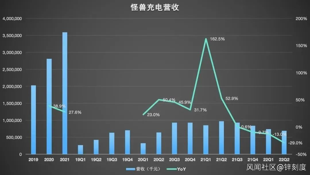 營收方面,財報顯示,怪獸充電第二季度總營收為6.905億元(約1.031億美元),同比下滑29%,環比下滑6.3%,這是怪獸充電連續三個季度營收同比下滑,連續四個季度環比下滑;