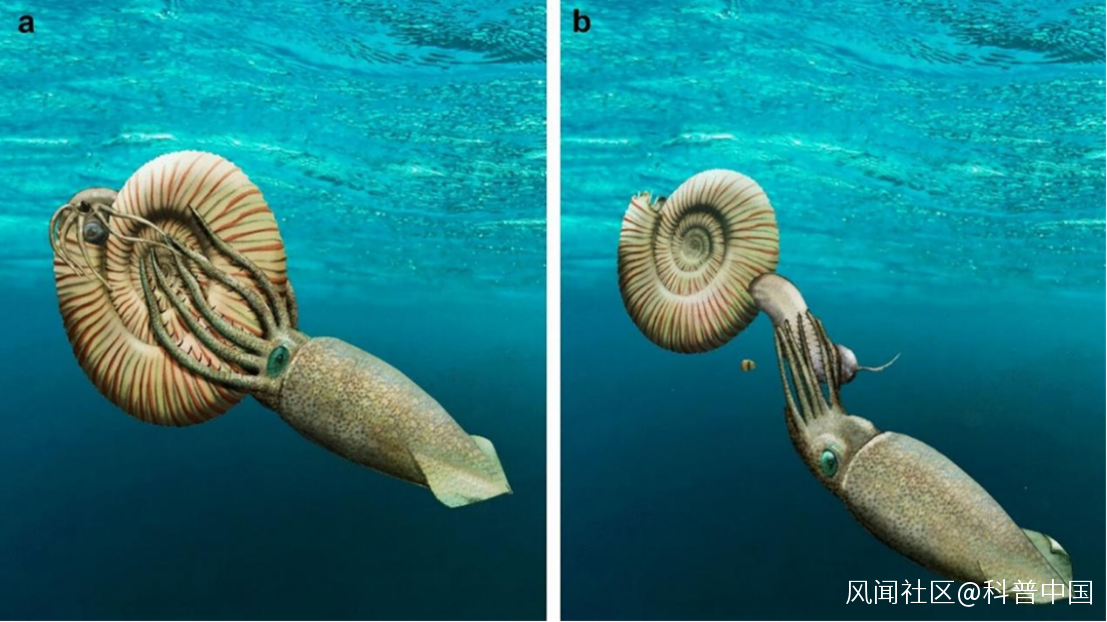 菊石和魷魚的祖先也曾一起生活,本圖描繪了魷魚的祖先近魷(右)捕食菊石(左)的畫面,圖片來源:參考文獻[6]