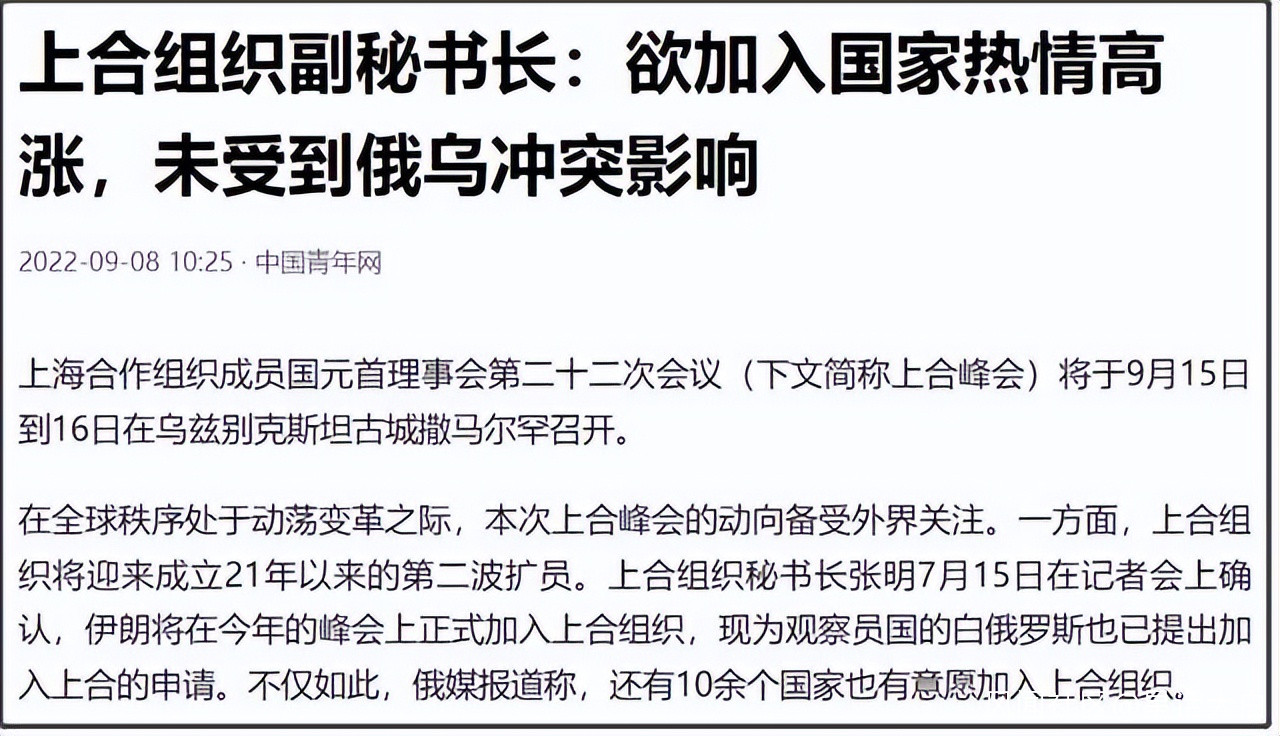 然後,2021年9月17日,上合組織啓動接收伊朗成為正式成員國的程序,並吸收沙特阿拉伯、埃及、卡塔爾為對話夥伴國。