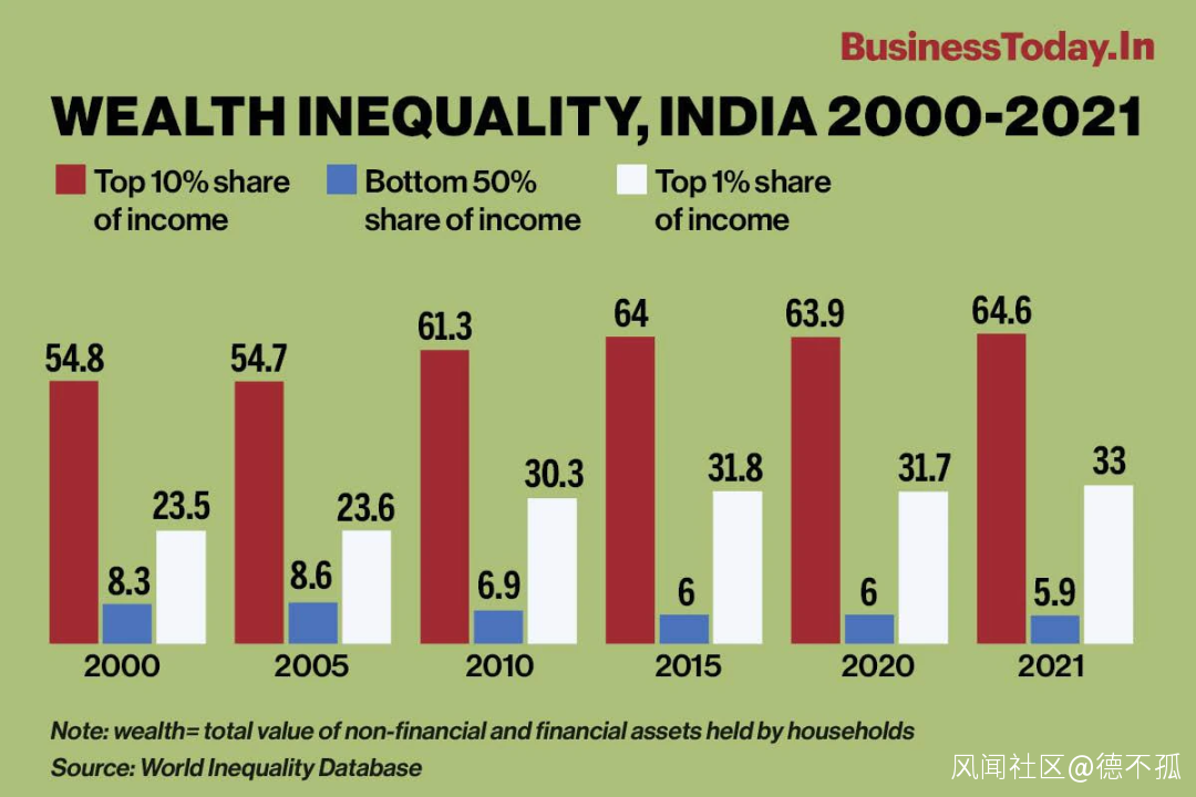 印度家庭財富的不平等程度已經非常高,又在過去幾十年裏進一步飆升。《世界平等報告》表明,最富有的1%的人擁有大約33%的財富,而人口中下半部分的人擁有大約6%的財富;1991年,這兩個數字分別為16%和9%。**這種不平等產生了拉丁美洲式的“秘密經濟”,**有限的經濟部門滿足了富裕的精英需要的資本密集型和技能密集型商品,而一般經濟則受制於需求不足和產能利用不足,總投資和就業水平因此低下。