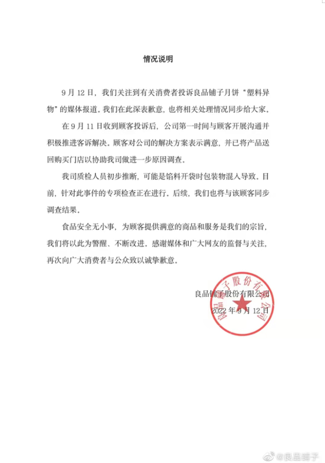 還在假期中的良品鋪子因月餅中吃出塑料上了熱搜。9月12日,良品鋪子發佈了情況説明。