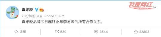 百“粒”桃一、“峯”芒盡現。作為蒙牛真果粒的代言人,2015年,蒙牛真果粒正式簽約了李易峯,雙方合作已有6年有餘。在上述消息發佈後當天晚間,蒙牛旗下品牌真果粒在官方微博發文:“真果粒品牌即日起終止與李易峯的所有合作關係。”據不完全統計,此事件後,李易峯所代言的PRADA普拉達、HONMA高爾夫、六福珠寶等多個品牌均終止了與其的合作關係。