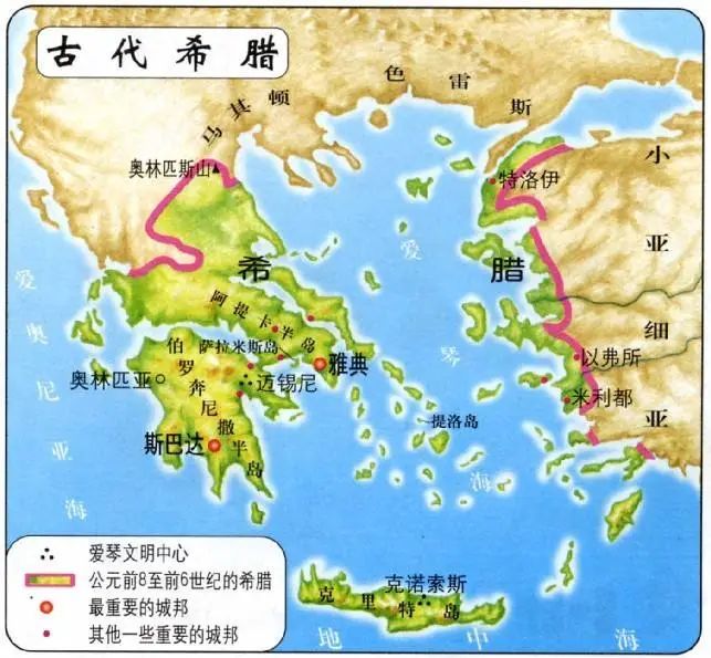 古希臘不是前面説到的那個跟土耳其衝突的希臘共和國,它也不是具體的某一個國家,而是泛指很大的一片地區,包括希臘半島、愛琴海和愛奧尼亞海上的羣島和島嶼,以及土耳其西南部、意大利東部和西西里島東部沿岸地區,一直到公元前146年,古希臘文明被羅馬帝國所滅,才退出了歷史舞台。