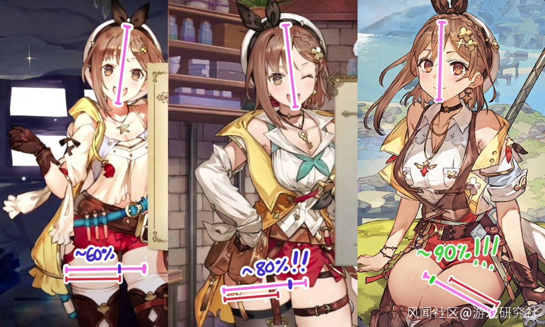為了觀察分析人設的轉變,推特R18畫師aikuxa採用臉部比例尺,詳盡對比了萊莎的大腿在兩部作品之間究竟是否有所變化。通過比較兩部遊戲封面宣傳的立繪,萊莎的肉腿有明顯的加寬趨勢。看上去像是製作組的刻意為之,不過在設定上第二作的故事發生於三年之後,17歲的妙齡少女有所成長也不足為奇。
