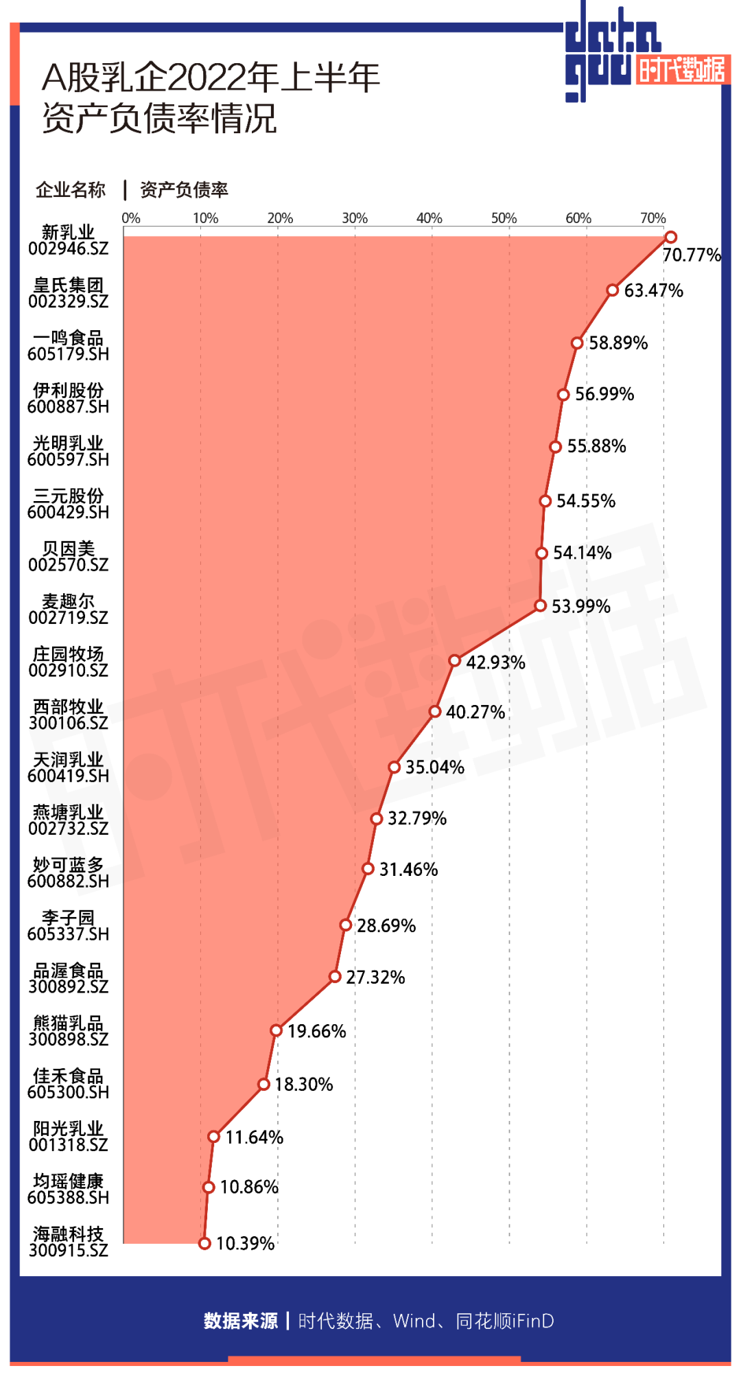 此外,一鳴食品(605179)、伊利股份(600887)、光明乳業(600597)、三元股份(600429)、貝因美(002570)、麥趣爾(002719)資產負債率達到50%。
