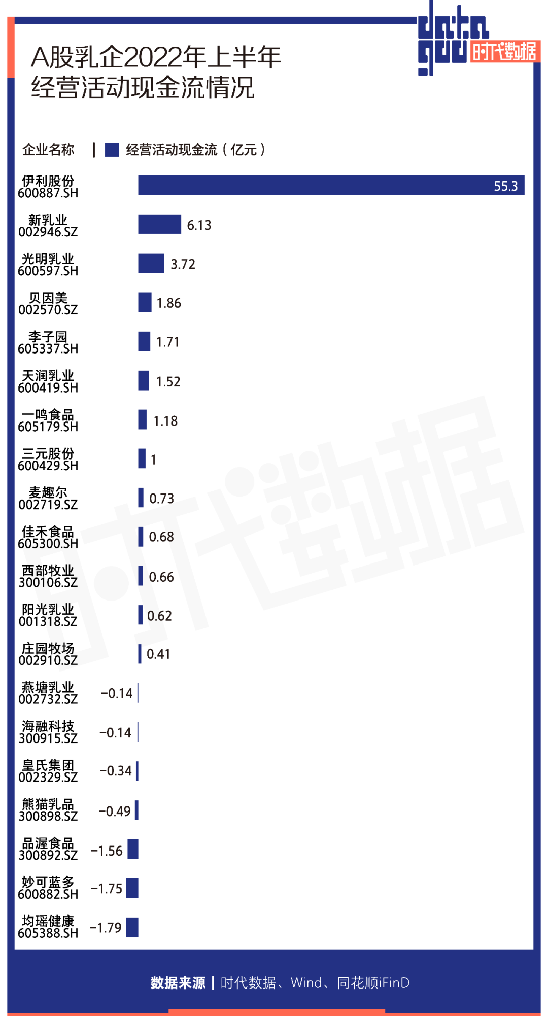 從經營活動現金流方面來看,有7家乳企2022年上半年經營活動現金流為負值。其中,均瑤健康(605388)、妙可藍多(600882)、品渥食品(300892)經營活動現金流淨流出位居前三,分別為-1.79億元、-1.75億元、-1.56億元。