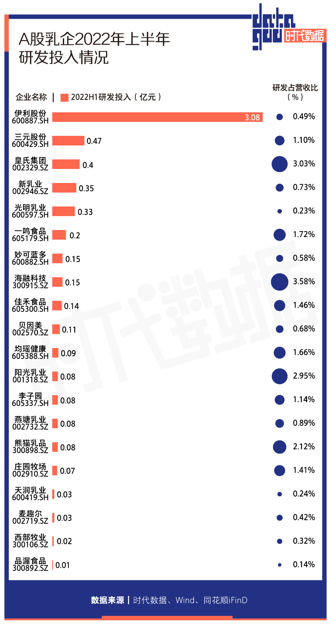 伊利股份(600887)上半年研發投入雄踞第一,達到3.08億元,佔營收的0.49%;其後,三元股份(600429)研發投入位居第二,為0.47億元,佔營收的1.10%;皇氏集團(002329)以0.4億元研發投入位居第三,佔營收的3.03%。