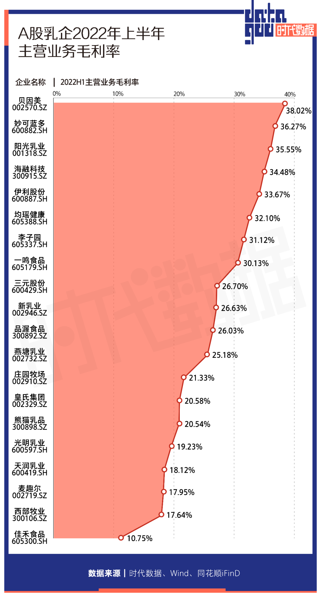 從A股乳企主營業務毛利率來看,今年上半年平均毛利率為26.1%,其中10家公司主營業務毛利率高於平均值。其中,主營業務毛利率最高的是貝因美(002570),達到38.02%;妙可藍多(600882)緊隨其後,主營業務毛利率36.27%;陽光乳業(001318)以主營業務毛利率35.55%位居第三。
