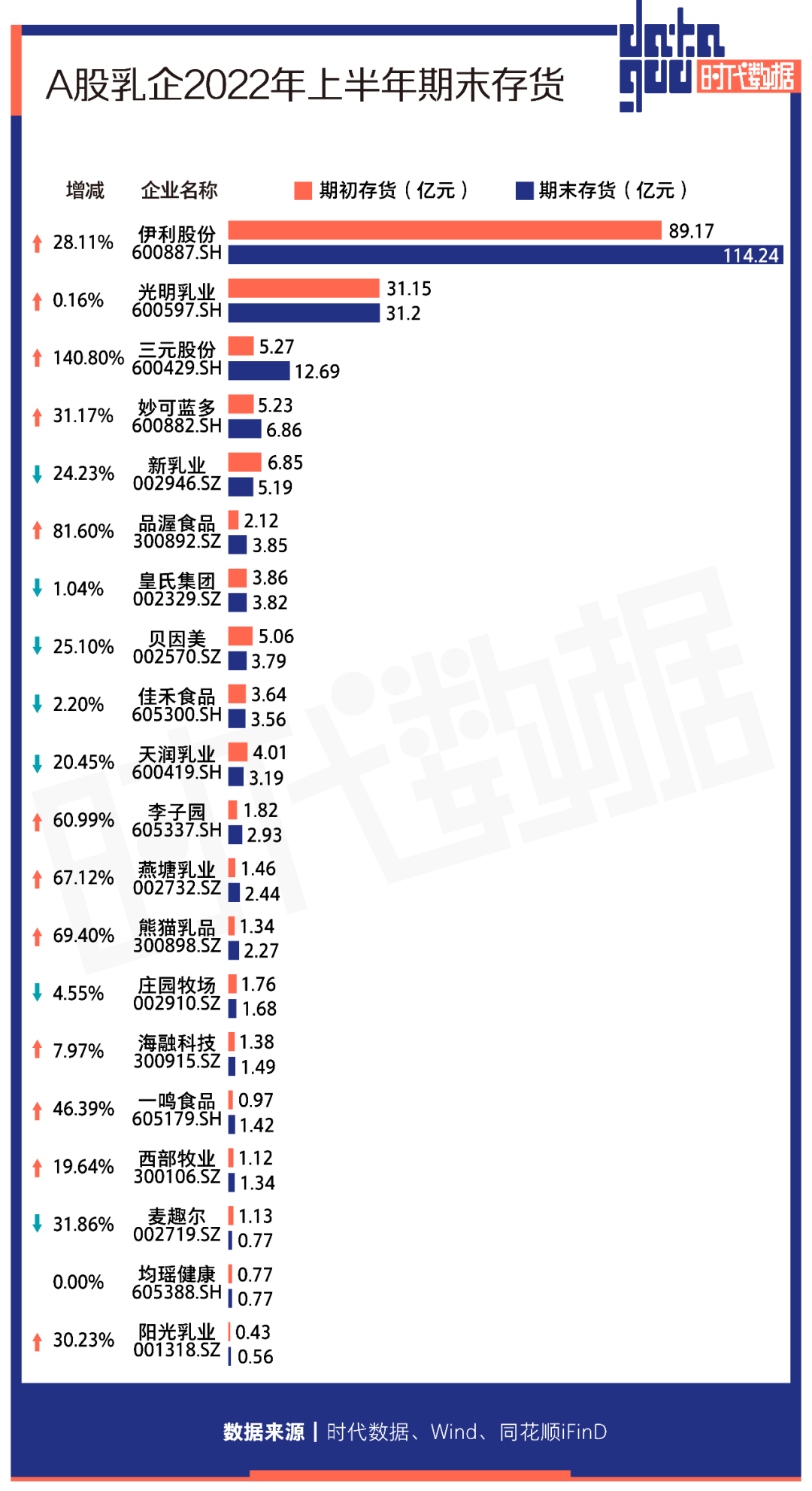 此外,伊利股份(600887)的期末存貨最大,達到114.24億元;其後,光明乳業(600597)、三元股份(600429)的期末存貨分別為31.2億元、12.69億元。