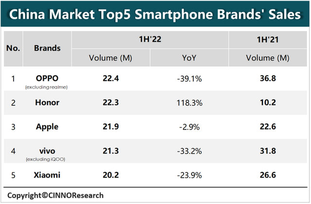 從各家廠商出貨量的數據來看,除開不太具有對比價值的榮耀,今年上半年OPPO同比下降39.1%,vivo同比下降33.2%,小米同比下降23.9%。即便是蘋果,同比也下降了2.9%,今年二季度財報首次出現利潤和營收雙跌的局面。
