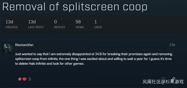 雖然 343 早早就為玩家畫了一張十年之期的大餅,並承諾:《光環:無限》作為《光環》下一個十年的開始,開發團隊將與粉絲和玩家一起搭建《光環:無限》。但直到現在遊戲並沒有更新任何新的劇情戰役內容,此前承諾的線上戰役合作模式和供玩家自由編輯地圖的鍛造模式(BETA)被延期至 11 月 8 日,而分屏合作模式更是被直接移除,令玩家無緣體驗和朋友在家面對面吹水的快樂。試想一下如果今後的大製作通通是這個半成品鳥樣,它還要漲價到 70 美元,那玩家該如何是好呢?