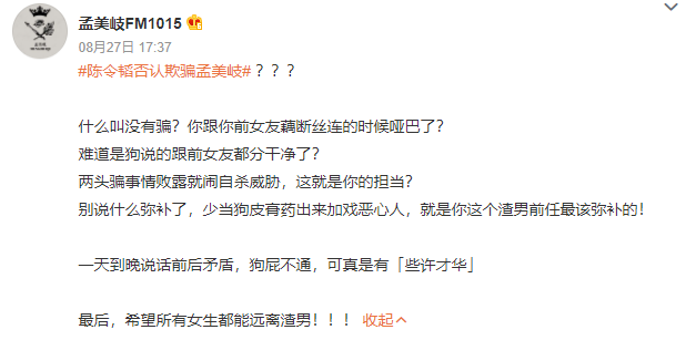 就是去年因為出軌事件鬧得沸沸揚揚的女愛豆,這次再發聲,是因為涉事男生出言解釋自己沒有騙孟美岐,疑似要蓋章對方是小三。
