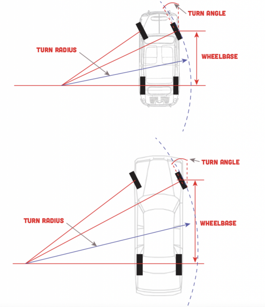 軸距縮短的另一個好處是爬坡能力增加。爬坡分兩部分:進入和離去。進入角是指從平地開始爬坡的角度,這由前輪向前的斜上切線的角度決定的。長頭卡車的前輪一般比較靠前,進入角的問題不大。但離去就不一樣了,不僅與後輪向後的斜上切線角度有關,還要在進入反斜面時前後軸之間不“擱淺”才行。這裏,短軸距再次優越。