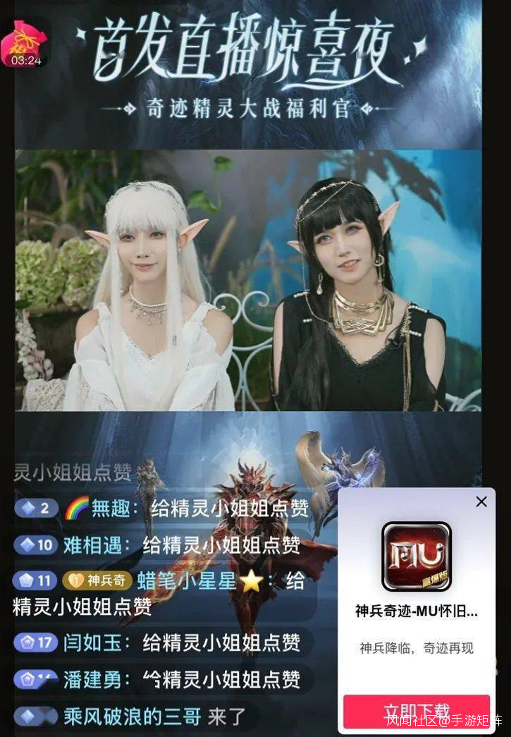 為了覆蓋了更全面的用户羣體,《神兵奇蹟》在直播上也選擇了於抖音、快手、視頻號三大平台進行同步的首發直播。隨着直播過程中兩位美麗奇蹟精靈主播的出現,直播氛圍愈發高漲。主持人對遊戲進行介紹後,精靈主播先是通過帶玩環節帶領觀眾瞭解遊戲,中間則是通過闖關遊戲等環節不斷調動觀眾氣氛,並於直播末尾再次對《神兵奇蹟》進行帶玩和介紹,期間直播全程都掛着小風車,方便感興趣的觀眾隨時下載,吸引了大量觀眾進行遊戲體驗,實現了流量的高度變現。