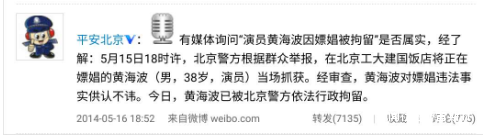 2014年,黃海波和張靜初拍攝《一場奮不顧身的愛情》。電視劇還沒拍完,黃海波嫖娼被拘了。