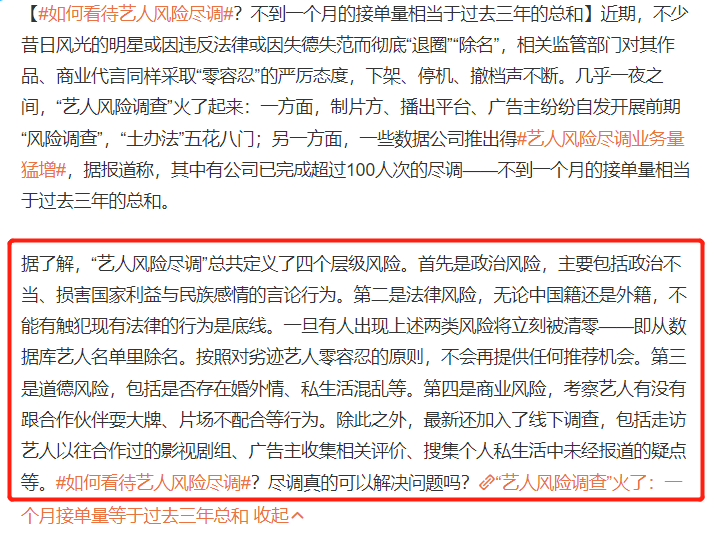 更有公司順勢而為,開闢了新業務,為合作方提供**“藝人風險盡調”**服務。
