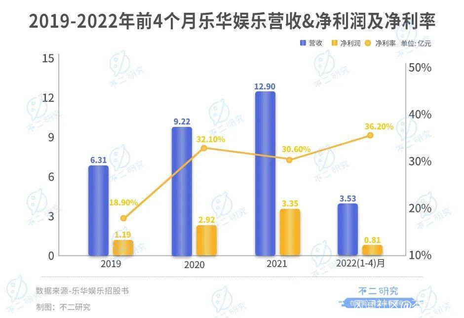 據招股書顯示,2019-2021年及2022年前4個月,樂華娛樂的收入分別為6.31億、9.22億、12.90億和3.53億元,複合年增長率為42.96%。年內淨利分別約為1.19億、2.92億、3.35億和0.81億元,淨利率18.90%、32.10%、30.60%和36.20%。