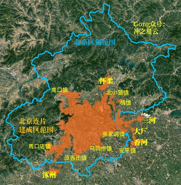 確實,一方面,他們的户籍、土地屬於河北省;但另一方面,他們的建成區又幾乎可以不間斷地一直連接到天安門。比如涿州、香河,比如眾所周知的燕郊。