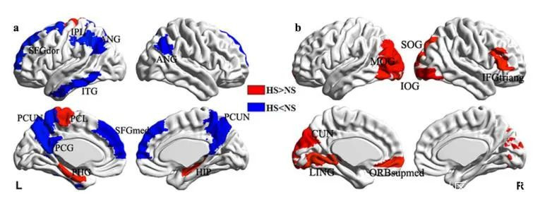 大腦神經網絡對比,藍色部分為不吸煙的人好於重度吸煙者的區域,紅色為重度吸煙者好於不吸煙的人的區域。可見除了視覺區域,不吸煙者的多個腦區神經網絡效率好於重度吸煙者。圖片來源:參考文獻[1]。