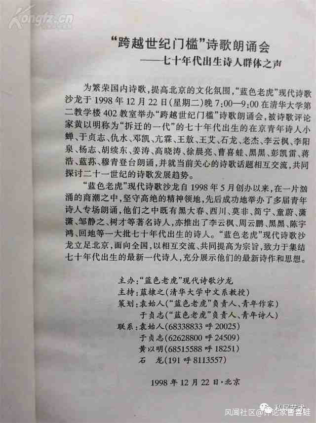 跟於貞志接觸就是這個時期,那幾年北京的詩歌沙龍很成氣候,有一年由他主持的藍色老虎詩歌沙龍主辦,請清華大學藍棣之教授和《青年文學》詩歌主持黃以明老師一起主持,在清華大學搞一次七十年代人詩人朗誦會,黃老師讓我做他的助手也一起參加組織策劃工作,最後也加塞參加了詩歌朗誦,因為我是1966年生的,所以不屬於70後詩人。