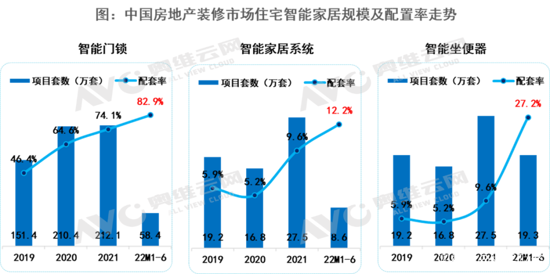 據奧維雲網地產大數據監測,2022年上半年全國新開盤精裝修項目中,智能家居產品精裝配套率大幅走高。