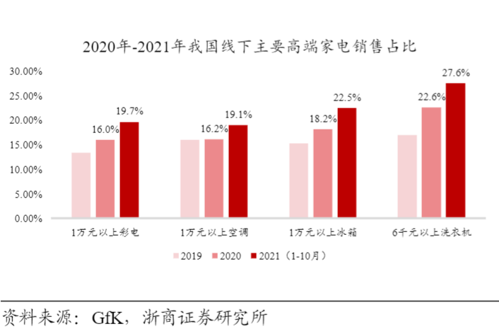 目前,消費者對產品性能的要求越來越高,在替換需求主導下,白色家電行業成長由“量增”轉變為“價增”。根據浙商證券研究,2019-2021年,我國線下主要高端家電銷售佔比不斷提升。