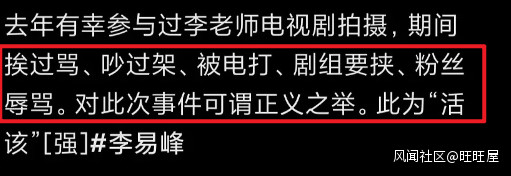 大家最憤怒的點也在於此:拿着這麼高的收入,結果背地裏搞這種下三濫的違法亂紀行為。滿嘴仁義道德,一肚子聲色淫慾。表裏不一,虛偽無恥,一直欺瞞粉絲和大眾。有人感嘆:“李易峯事件,讓人見識到了什麼是牆倒眾人推,鼓破萬人捶”那也是他違法,他活該。當紅的時候,污點、槽點尚有公關維護,人們只看到他的光芒亮得讓人睜不開眼。塌房之後,無數黑料這才有機會攤在了陽光底下。有人曝光他沒禮貌,不敬業,耍大牌。疑似李易峯替身發文稱和他拍攝期間,捱過罵、吵過架、被電打、劇組要挾、粉絲辱罵。比如拍攝中指導李易峯水下憋氣,卻被“友好問候”;比如替身被電,卻被粉絲罵:“掙的就是這種錢,不電你電誰”一天208w輕輕鬆鬆的娛樂圈,動不動用替身的娛樂圈,收入和付出,真的對得起大眾的喜歡嗎?