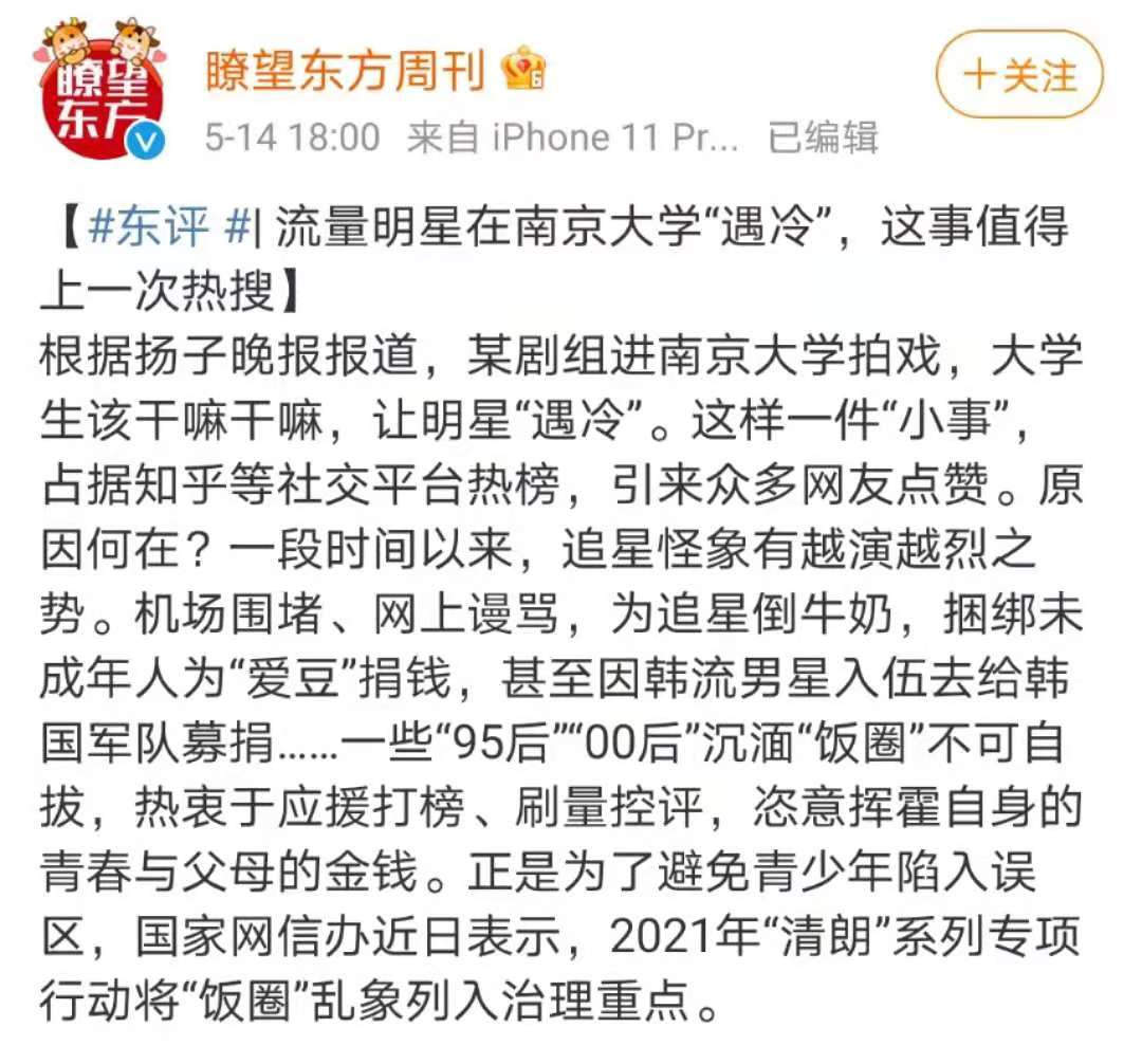塌房速度越來越快,人數越來越多,底線越來越低。每隔一段時間都會有負面新聞曝出來,所以才有人説:“李易峯被曝,只是冰山一角”當你在陽光下看到一隻蟑螂時,説明暗處已經多得擠不下了。娛樂圈這個充斥着權利和利益的大染缸,讓淺薄的人,變得更加淺薄了。也讓很多人漸漸地對娛樂圈失望了,那些隱秘、荒蕪、幽暗,那些違揹人性、踐踏底線,讓身為普通百姓的我們,不敢再往深處想。“眼看他起高樓,眼看他樓塌了”,見多了這樣的大反轉之後,我們也看見了更多理性的聲音。有網友評論道:“從來不追星,我們應該追的是那些為國家、民族和社會做出過重大貢獻的人。不愛追星,我寧願把時間用來沉澱自己。”就在去年,頂流明星被南大“羞辱”事件 ,曾衝上熱搜。起因是關曉彤、張一山、範丞丞等一眾明星,在拍攝影視劇《曾少年》時,曾到南京大學校園內取景。和過往見到明星就一股腦地一擁而上的熱鬧場景不同的是,在這座歷史悠久、聲譽卓著的百年名校,這些頂流遭到了意料之外的“冷待”。