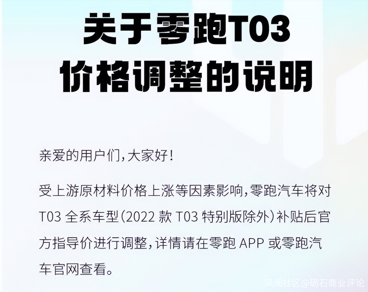 7月31日,由於鋰電池等原材料價格的持續上漲,零跑已經對T03車型全系進行了價格上調,補貼後售價從之前的7.39萬元到8.99萬元,漲價為7.95萬元到9.65萬元。調整後的價格已經於2022年8月1日零時正式生效。