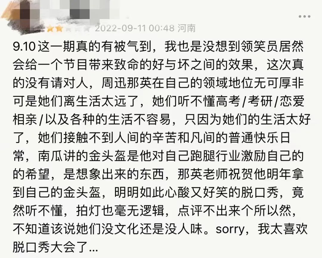 更深一層講,是觀眾對於明星的期待改變了:尤其是,在《脱口秀大會》這樣一個與生活緊密相關,選拔通道也仍舊具備着草根性的“極致”舞台上,非專業因素的加入,更能激起與舞台共情後的觀眾的憤怒。