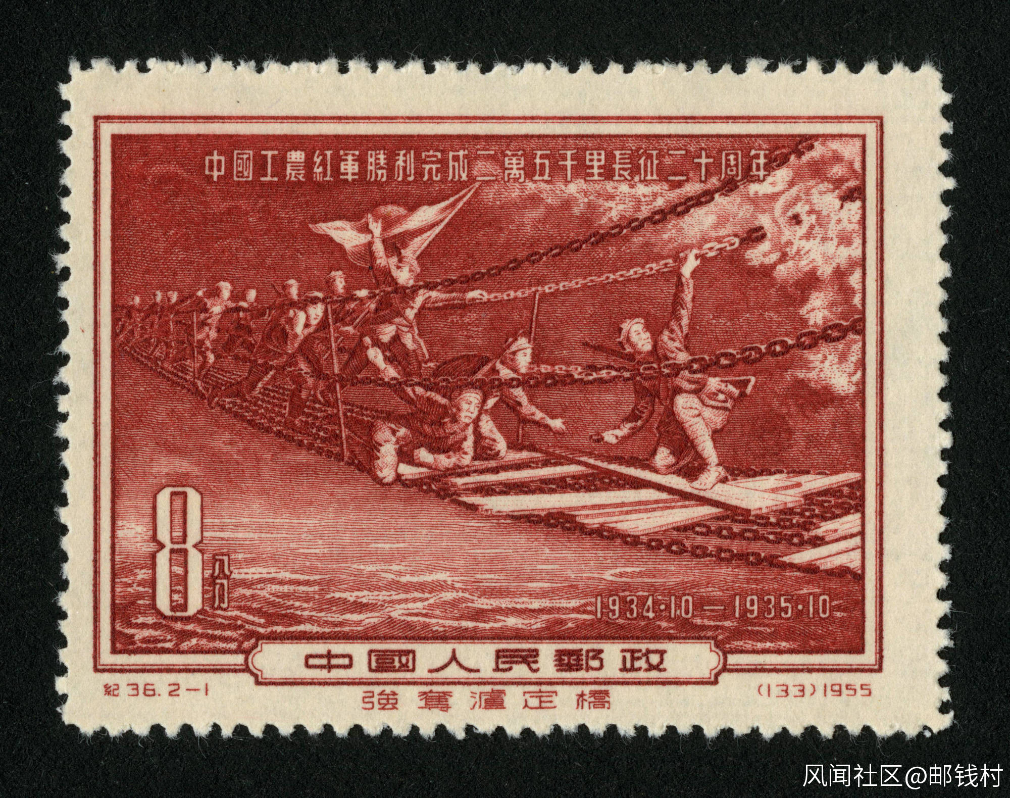 為紀念紅軍長征勝利完成20週年,中國郵電部於1955年12月30日發行了《中國工農紅軍勝利完成二萬五千里長徵二十年》紀念郵票,全套2枚。該郵票原畫作者為李宗津先生與黃丕星先生,由孫傳哲先生設計,孔紹惠先生雕刻者,北京人民印刷廠營業分廠印製。