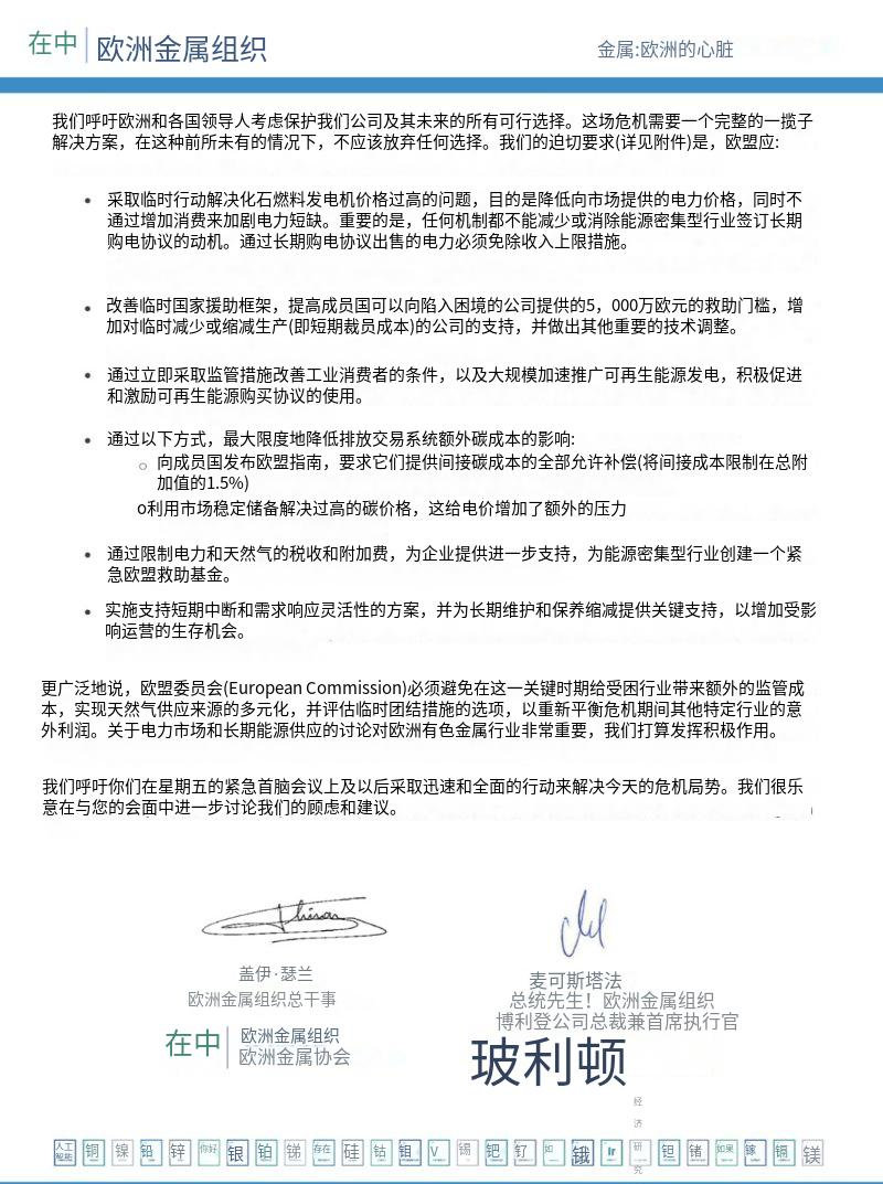 9月初,歐洲有色金屬行業聯名向歐盟領導層發出一封公開信,在信件里歐洲企業家呼籲歐盟高層趕緊拿出對策解決歐盟正在面臨的“去工業化”的問題。
