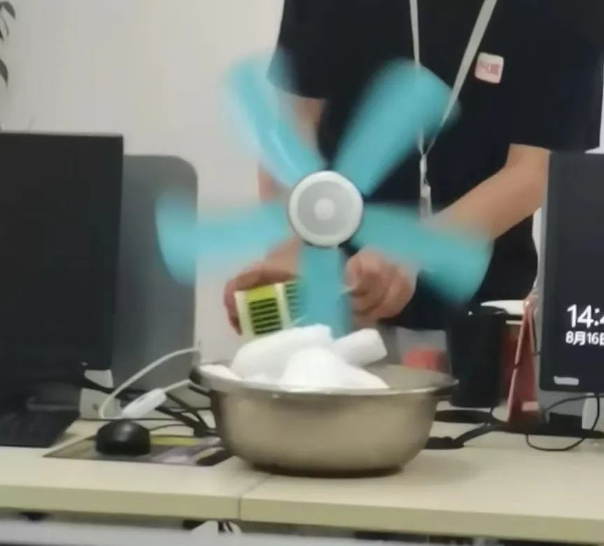 後來,盧月姍和同事們就用實驗室的冰櫃提前凍一盆冰,第二天端到辦公室,再用風扇吹冰塊來製冷降温。